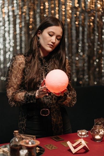 Divination and scrying are powerful tools for gaining insight and guidance. Techniques like tarot, runes, and mirror gazing allow practitioners to connect with subtle energies and uncover hidden truths. Scrying involves focusing on reflective surfaces, such as water or crystal balls, to receive visions or impressions. A calm mind and focused intent are crucial for accurate readings. Regular practice enhances intuition and deepens understanding of these mystical practices, making them invaluable for personal growth and decision-making in sorcery.