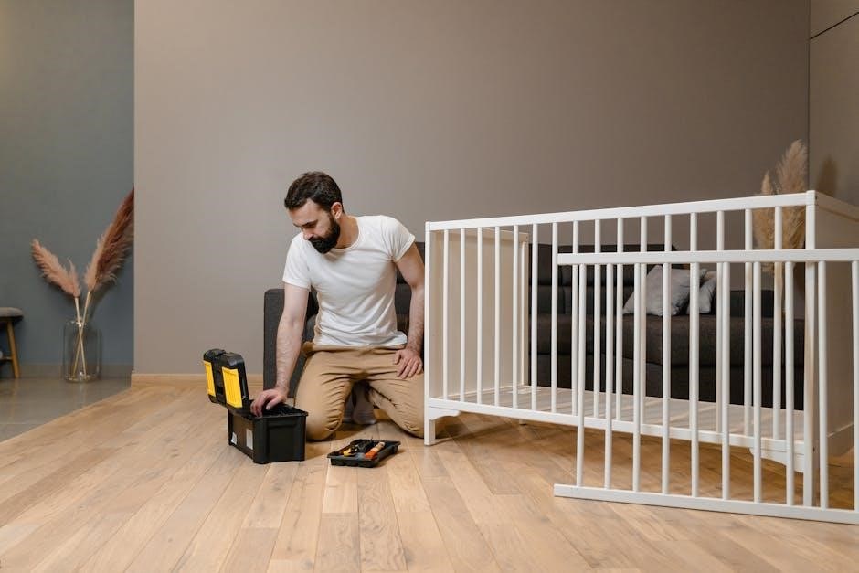 Following the Delta 6-in-1 Crib assembly instructions is crucial for ensuring the crib is assembled correctly and safely. Proper assembly guarantees the crib’s structural integrity, preventing potential hazards for your child. Incorrect assembly can lead to instability, which may result in accidents or injuries. By adhering to the instructions, you ensure all parts are securely fastened, and the crib meets safety standards. Additionally, following the guide helps avoid costly mistakes, such as damaging parts or stripping screws. This step-by-step process also saves time and reduces frustration, ensuring a smooth and efficient assembly experience. Always prioritize your child’s safety by assembling the crib as instructed.