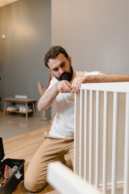 To attach the side panels and rails, first, locate the pre-drilled holes on the crib frame where the panels will be secured. Align the side panels with these holes, ensuring they are flush with the frame’s edges for a snug fit. Use the provided screws or bolts to fasten the panels, tightening them firmly with a screwdriver or Allen wrench. Be cautious not to overtighten to avoid damaging the material. Next, install any additional support rails, following the manual’s diagrams for correct positioning. Ensure all connections are level and aligned to prevent instability. Secure any locking mechanisms or safety latches according to the instructions to guarantee the panels are safely in place. After attaching, perform a stability check by gently shaking the crib to verify everything is secure. If any part feels loose, revisit the connections to tighten as needed. Properly attaching the side panels and rails is essential for the crib’s structural integrity and safety.